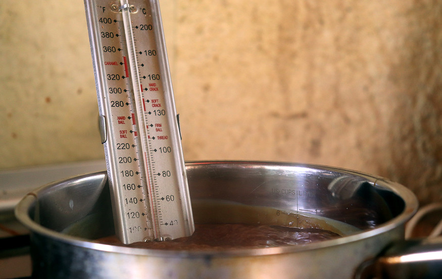2. אחרי הרתיחה מנמיכים את האש, וממשיכים לבשל - בלי לערבב! - במשך כ-30 דקות עד להתקרמלות. אם יש מדחום: מבשלים עד ל-100 מעלות, ואם אין - מטפטפים על גבי צלוחית קרירה, עד למצב שבו הטיפה שומרת על צורתה.